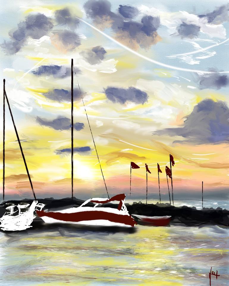 The soft yet dramatic sunset colors dancing on the sea, invited me to paint this scene. I painted in oil and acrylic for years; I am now working digitally. Even though I create on an iPad, I am still painting, blending and mixing colors, applying strokes; it's all there.