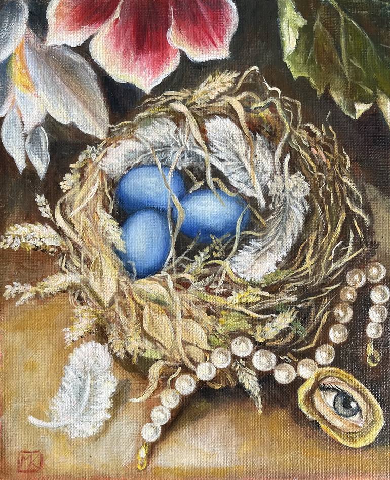 In my work I was inspired by classical still life’s of XVIII c . This painting is symbolic , a nest with eggs is a symbol of happiness and a new life. I painted also some rare type of jewelry a lover eye . I used a traditional oil technique with glazers .