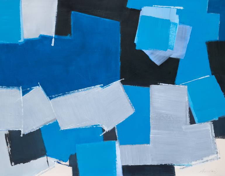 This work "Harbor" is minimalist and geometric abstract style. It seeks to reduce shapes, colours and lines to a process of synthesis and simplification, seeks to maintain balance and composition. It is acrylic with casein glue on cotton duck canvas. This work is signed in front and back and is de...