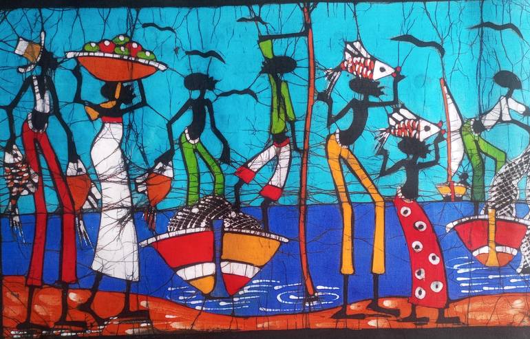 This vividly colored batik painting, Harvest of the Waters, captures a lively scene of African fishermen and women engaged in their daily fishing routines. They carry baskets and fresh fish. Small boats float alongside and birds in sky. Against a striking blue backdrop, the figures move with purpo...