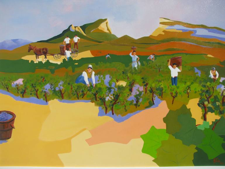 This original oil painting on canvas, titled "Harvesting in the old times", captures a scene from rural life during the wine harvest. The artist was inspired by the traditional harvesting methods of past decades in the Languedoc region of southern France. It depicts a horse-drawn cart laden with gra...