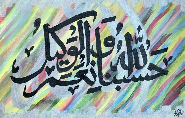 “Hasbunallah wa ni'mal-Wakil” means “Sufficient for us is ALLAH, and (He is) the best disposer of affairs”. Did this calligraphy with black and colourful background with silver ALLAH beautifully written on it. Any Muslim understands that Allah is the Bestower of Mercy. He alone can remove any harm...