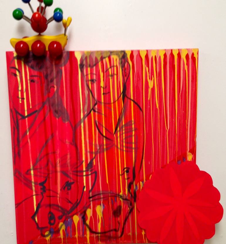 The work was inspired by an opportunity to work in China. The images are influenced by trips to temples with large drawings painted inside the stone temples. The found object is a toy in the painting and is the hat of a woman. Special hats are worn and are regarded as a living way for them to honor...
