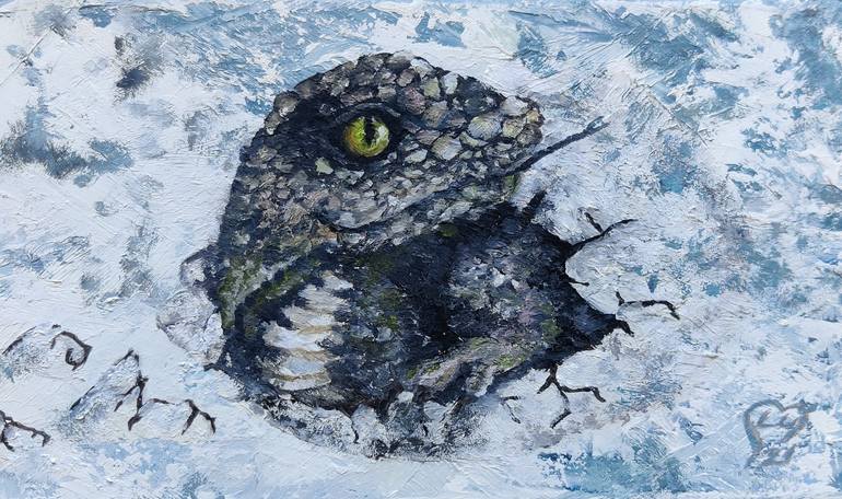 "Hatching Baby Lizard" is an oil painting that depicts the moment of birth of a small lizard. The background is a cool white and light blue, creating a frosty and crisp atmosphere. The cracked eggshell, in the foreground, gives a sense of fragility and vulnerability. The brushstrokes and textures us...