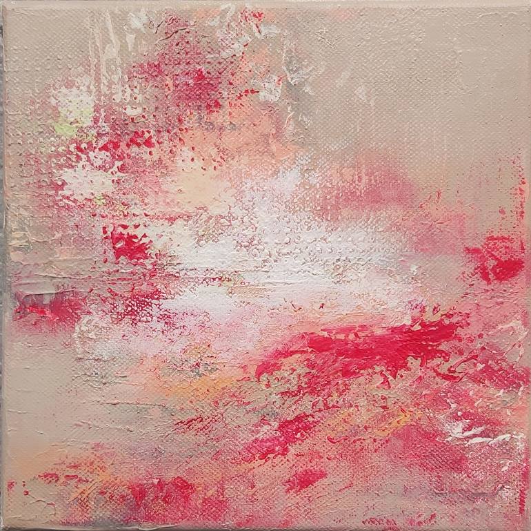 This artwork is a small piece with warm colors and different textures. There are prints and marks, and relief done in the fresh paint, to create this abstract landscape. The side is painted in black, so the painting doesn't require a frame. It is ready to hang.