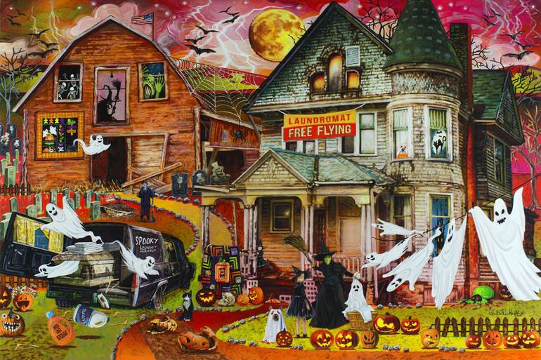 In this painting, I've captured a whimsical yet spooky Halloween scene at a bustling laundromat, framed by nostalgic Victorian architecture. Evoking a blend of warmth and mystery, I used vibrant acrylics to bring to life the spirited dance of ghosts and the playful pumpkins under a moody, moonlit sk...
