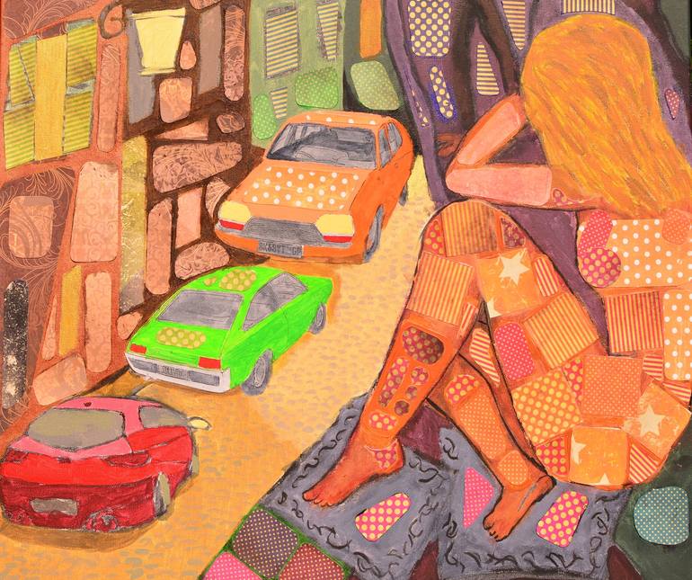 A young woman is watching the street from her window. The person she is waiting for is late. Acrylic with additional paper on canvas. Sealed with pva and varnish. Unframed, mounted. Initialled, signed. Authenticity document.