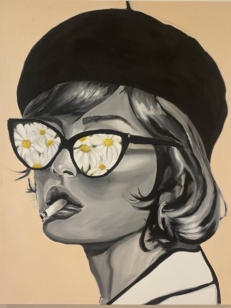 The painting depict a Portrait of Taylor Lashae, internet muse of our time wearing daisy covered sunglasses.