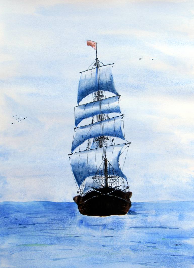 A sailing ship coming straight at you, with a rare combination of healthy breeze and calm seas
