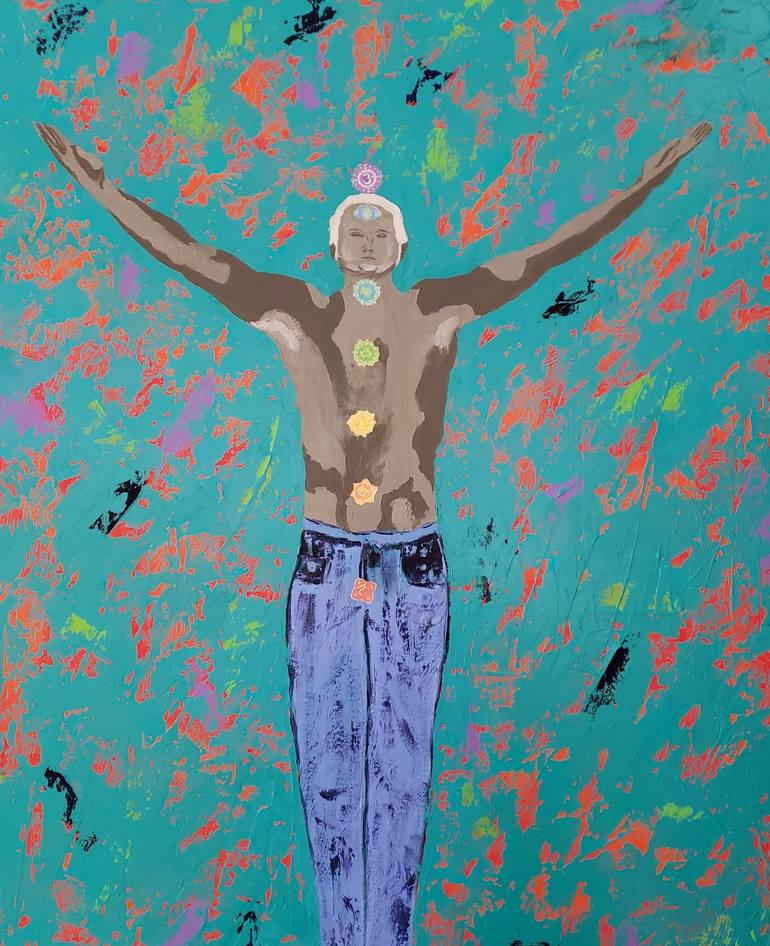 I have recently received my master certificate for Reiki energy healing so chakras have been on my mind lately. This would be perfect for a massage or Reiki studio. I used palette knife technique of color over color. The flashes of color coming off his body represent energy. Varnished for UV & d...
