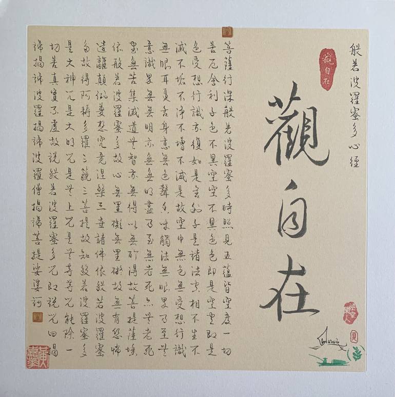 Heart Sutra by Chinese Calligraphy wrote on paper. The subject of this writing is Bodhisattva, 觀自在/觀音。 The Heart Sutra is the most popular sutra in Buddhism. In Sanskrit, the title Prajñāpāramitāhṛdaya translates as "The Heart of the Perfection of Wisdom". The Sutra famously states, "Form is empt...