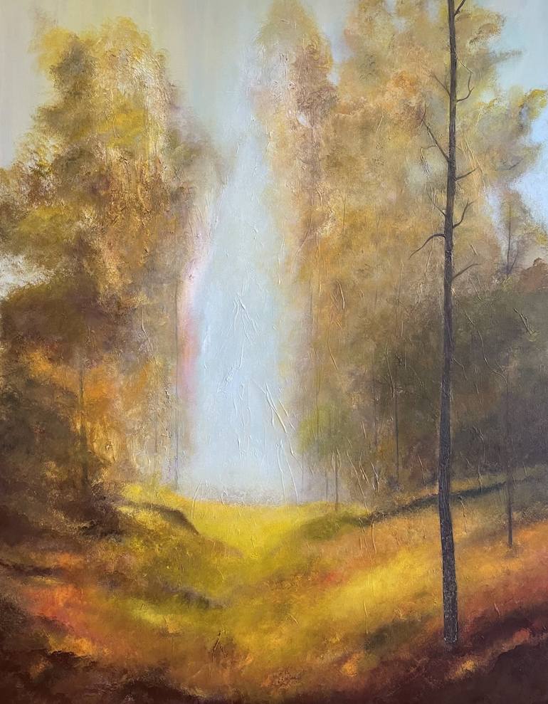 In this enchanting painting, the essence of autumn unfolds before our eyes. A tapestry of warm, vibrant colors captures the transformative beauty of the season. The leaves, transitioning from vivid green to fiery oranges and golden yellows, create a breathtaking canopy overhead. Some leaves have gen...