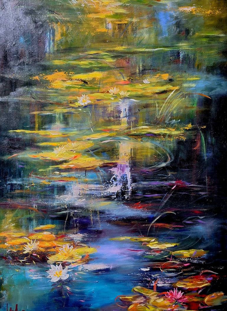 In creating this work, I delved into the quiet mystery of the moon pond, the way the light reflects on the water and leaves, inviting introspection. The night scent with the color palette of yellow, blue, black, and purple creates the shimmering and mysteriousness of the night, the scent of plants, ...