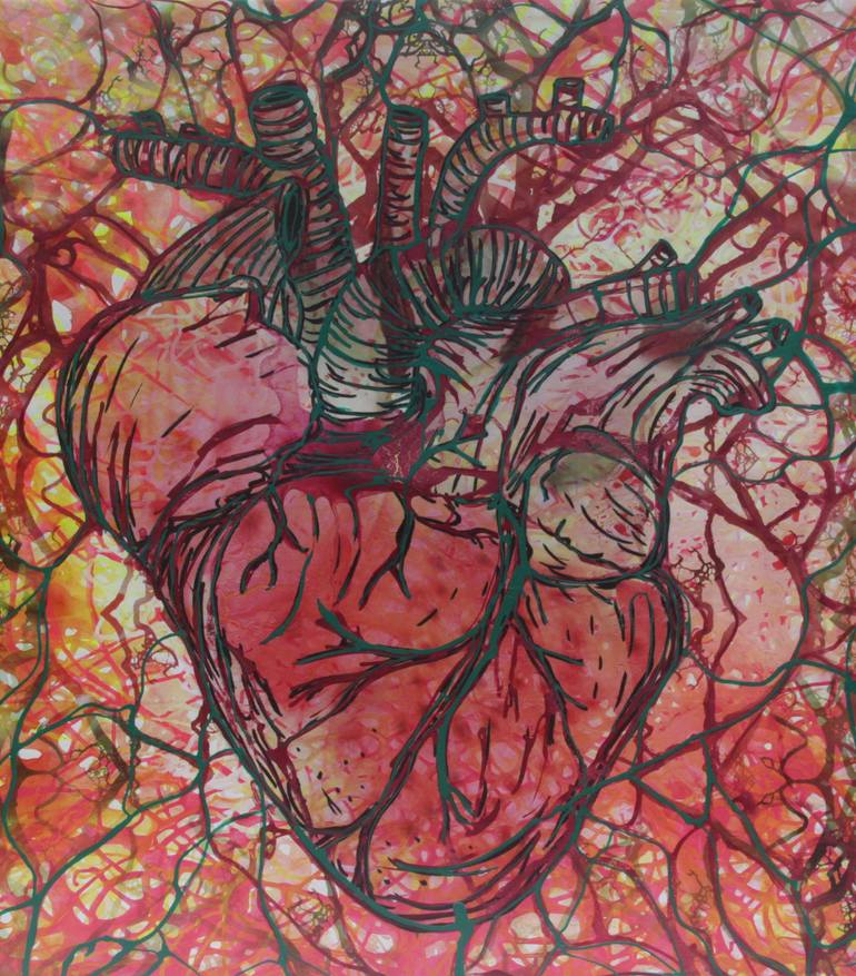Heart is inspired by my series of paintings ¨The Fabric of the Cosmos¨ and its relationship with the cardiovascular system and saguine tissue, where the heart keeps the blood moving in our body in a unidirectional way, it is a closed circuit, nothing is lost and everything is interconnected.