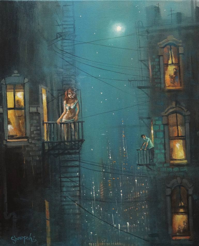 " I love the romance of the city at night. I am a painter of contemporary night city scenes, Abstracts, Urban Fantasy scenes and narrative works inspired by pop culture. I try to express mystery, beauty, and wonder in all my work. Lights glittering like broken glass have always fascinated me. The sparkle of city street lights, the neon signs, and the pulsing glow of traffic, create a sense of excitement and an underlying feeling of danger and edginess that is almost intoxicating!" Why I love to paint the rain - "An early childhood memory of a car ride with my parents during a cold night thunderstorm has been indelibly etched into my mind. Huddled in the back seat under a wool car blanket with my brothers and sister, I was warm and safe as the rain pounded the metal roof and the tires swished and hissed through the flooded streets. Surrounded by warmth and hearing the murmur of my parent’s voices I drifted in and out of sleep and watched the wavering reflections of colored lights reflected by the streams and droplets on the steamy window glass. I have never felt as safe and loved as I did that night. Lulled by the rhythm of the windshield wipers and the sound of distant thunder, I fell asleep. Even today a stormy weather soothes me, but I also do some of my best painting when working on rainy days." ~ Tom Shropshire