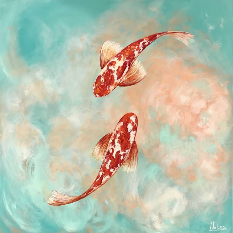 "Heaven", features two koi fish swimming serenely in a dreamy, pastel-hued pond. The soft colors and flowing forms create a tranquil and meditative atmosphere. Technique: Finest, highly pigmented acrylic paints on a 4cm deep canvas, finished with a neutral semi-gloss varnish that enhances the vibra...