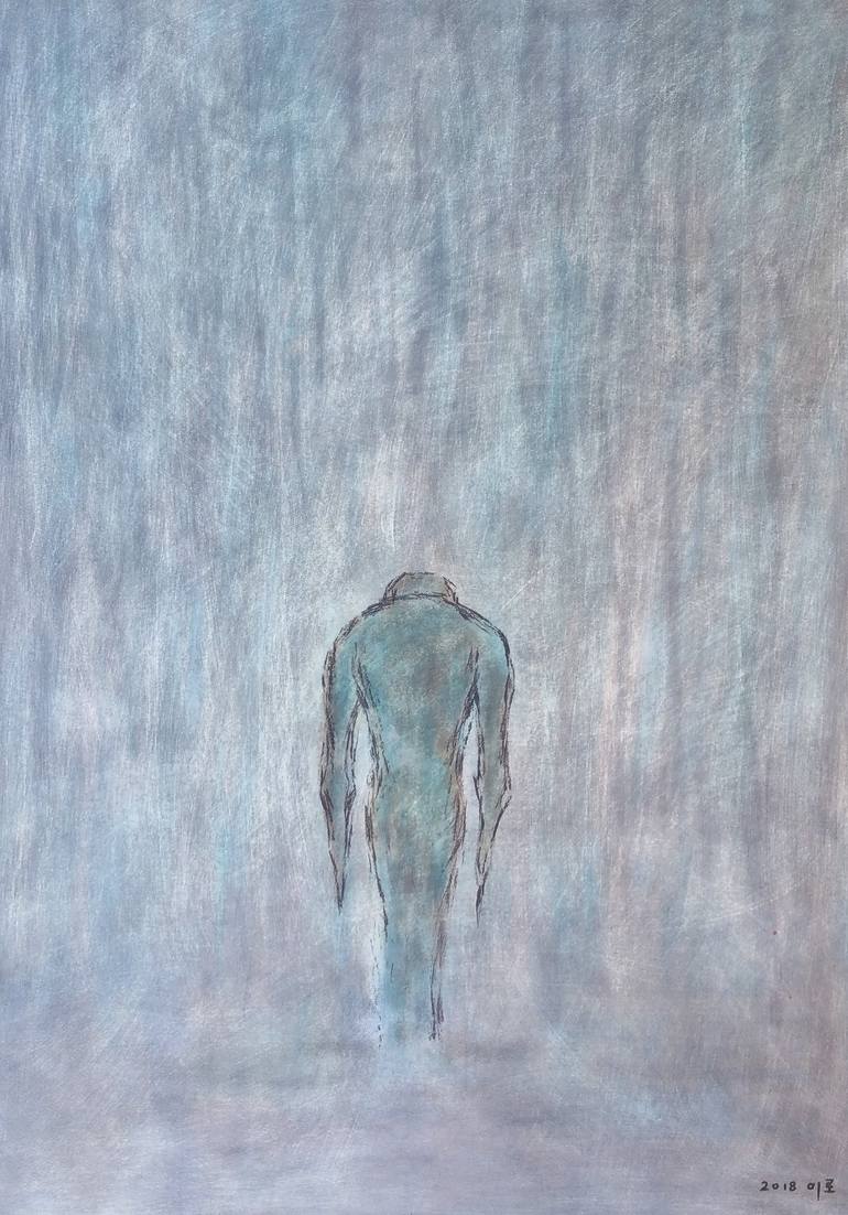 'Heavy Rain' colored on Paper 2018. Man is alone in heavy rain.