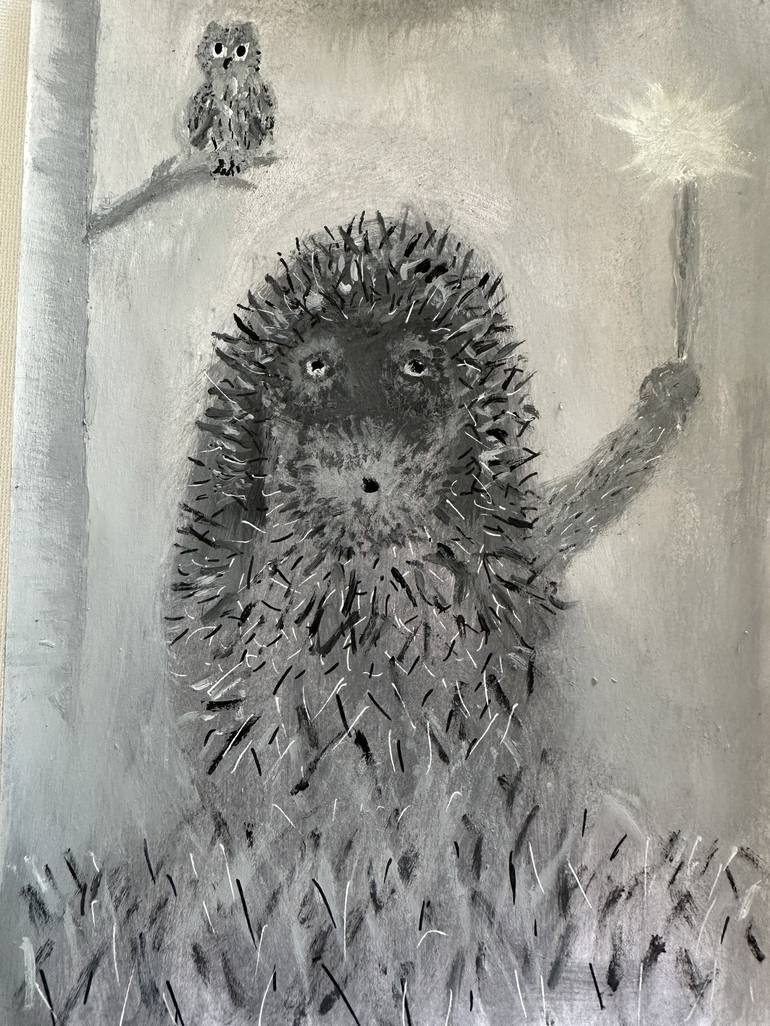This drawing, rendered in shades of gray, portrays a charming hedgehog standing upright, holding a glowing star or light in one hand. The hedgehog's spiky fur is depicted with simple black and white strokes, adding texture and depth. Perched on a branch nearby is a small, wide-eyed owl, observing th...