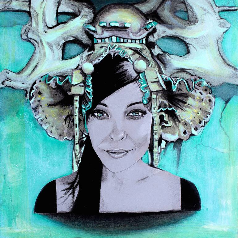 When painting, headdresses and crowns deify Kate Kelton’s subjects. She uplifts the Unsung Sheroes & Heroes, Patriarchy Smashers, Warrior Survivors, Silence Breakers, Philosophers, Truth-Tellers, Whistle Blowers and Thought Giants of all stripes. She paints her portraits cloaked in the garb of statues Ladislav Šaloun sculpted onto the train station that her great-grandfather, Josef Fanta, designed for Prague in 1901 - 1909. Apotheosis through a reclaimed, reapplied Art Nouveau. Sampling her own lineage, she transforms a historical body of work, itself a thing of lasting beauty; exchanging granite for graphite, plaster for paint. In Photoshop, she first combines the desaturated faces she's found, sourced or shot of her chosen subjects, with the black and white photos from her family and friends, of the statues in situ. Then she uses graphite, inks and acrylic paints and glazes to create the works on panel or canvas, literally uplifting and elevating her battle-weary subjects to the highest reach of architectural strata. 'Ancient and distant godlike beings, surveying a dying empire, trade places with the fresh blood of her subjects. The work presents a tactility against the digitized space, and represents a taking, an acquisition of power back from the tastemakers. Here, the mantle of the artist is above brand influencer, above internet commentator, above mere marketability. In their gaze is a warning, “Art is immortal. Come for me, why don’t you?”' ~ Micah Chaim Thomas "Kate's recent work is a matter of expansion through contrast - she is as ephemeral as her subjects are concrete architecture; she is structural when her subjects should slip through your fingers like too-fine sand. Taken as a whole, the works in her magnificent series Sentry are incredibly intelligent, but when looked at individually, you come to understand that these are statements of life beyond themselves. The series take embellishments of a Prague train station designed by her great-grandfather, Josef Fanta, and combines these with portraits of women who have stood against the sexual harassment and assault rampant in Hollywood. These women, like Kate herself, have suffered in the era where powerful men, every bit as immovable as the train station, wielded their power without check. The portraits emblazoned on architectural elements, they are marked against the edifice, every bit as permanent, and perhaps even more defining.