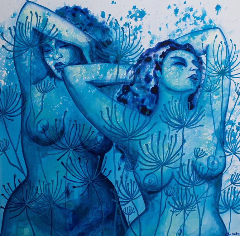 The picture "Heracleum" 2023 Canvas, acrylic. Size 90/90 cm. Author's work. The theme of the work is female beauty and freedom. Love for your body. The perception of oneself as a free spirit of the earth.