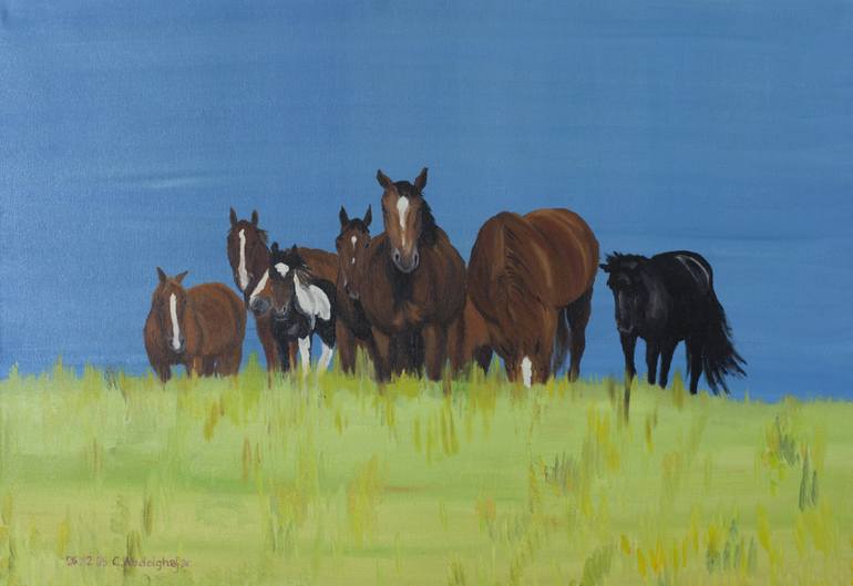 This atmospheric oil painting captures the essence of the freedom and naturalness of a herd of horses on a wide summer pasture. The horses stand close together on a lush, yellow-green meadow that dominates the foreground of the painting. The bright green of the grass forms a vivid contrast to the in...