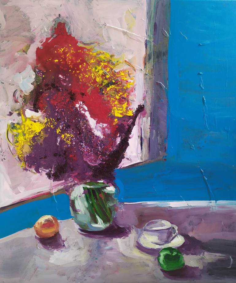 Sometimes, it’s nice to kick back in a comfortable chair, grab a cup of coffee, and enjoy the sights around you. It’s especially true with this light and colorful acrylic painting in your home. A lone pot of red,purple and yellow flowers sits atop a pleasing blue surface, joined by a full cup of hot...