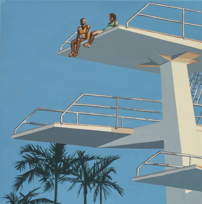 Following on from my recent collections of Mid Century inspired style is scene of a couple Friends chatting on top of the dive board in sunny palm tree lined location. Bring with it my love of Architecture this was fun to paint. Painted on all sides & ready to hang. Painted in acrylic on box ...