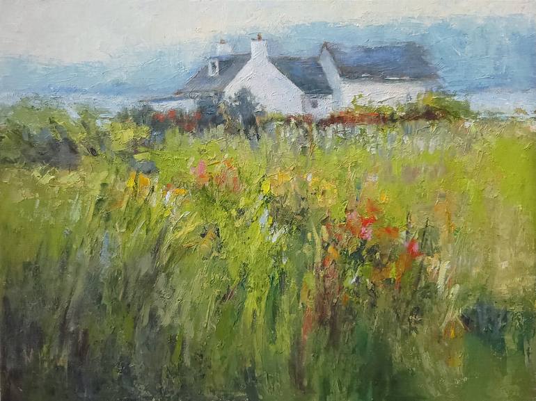 A peaceful countryside scene showcases two quaint houses in the distance, partially obscured by lush greenery and colorful wildflowers in the foreground. The sky is overcast with a hint of blue mountains in the background.