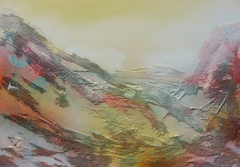 A semi-abstract depiction of a mountainside enveloped by mist. Created using sand, acrylics and spray paint on canvas. Signed on the back.