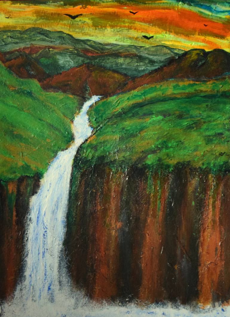 Acrylic paint on acrylic paper painting representing the sunset over a small river descending between Highland rocky mountainsides and dropping as a cascading waterfall over cliffs into an adjacent loch as birds fly overhead.