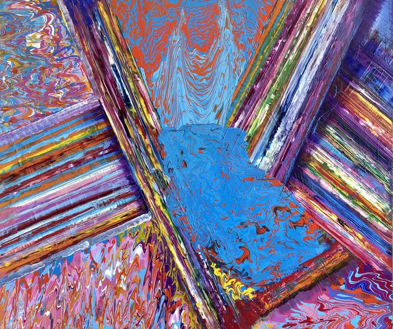 One of a series of oil paintings about concrete macadam roads, flyovers, spaghetti junctions, skyscrapers--the rush of city life. The work describes speed, movement, and energy. Chevrons and signposts lead the eye across the canvas and back again. The flood part is composed of pale ceruleans and com...