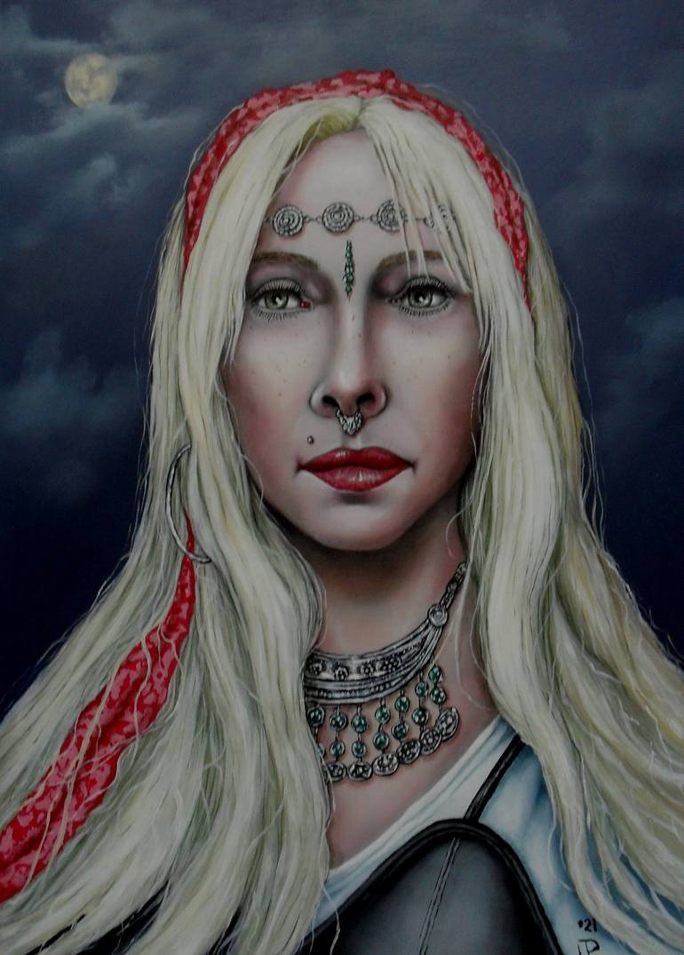 Oilpainting on wood with the theme:portrait Luzabril singer songwriter from argentina. Song: Hija de la luna.