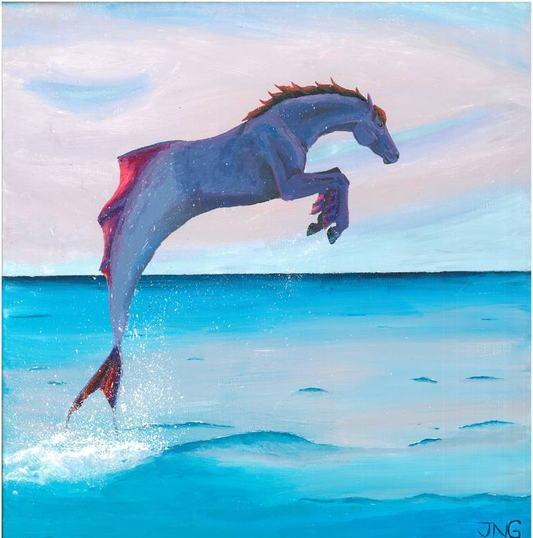 Acrylic paint on a 30 by 30 cm canvas. Hook included. This painting depicts a Hippocampus, a mythical waterhorse that pulls Poseidon's carriage in Greek mythology, frolicking around and jumping out of the water, enjoying its freedom. Hippocampi have the front end of a horse and the rear end of a f...
