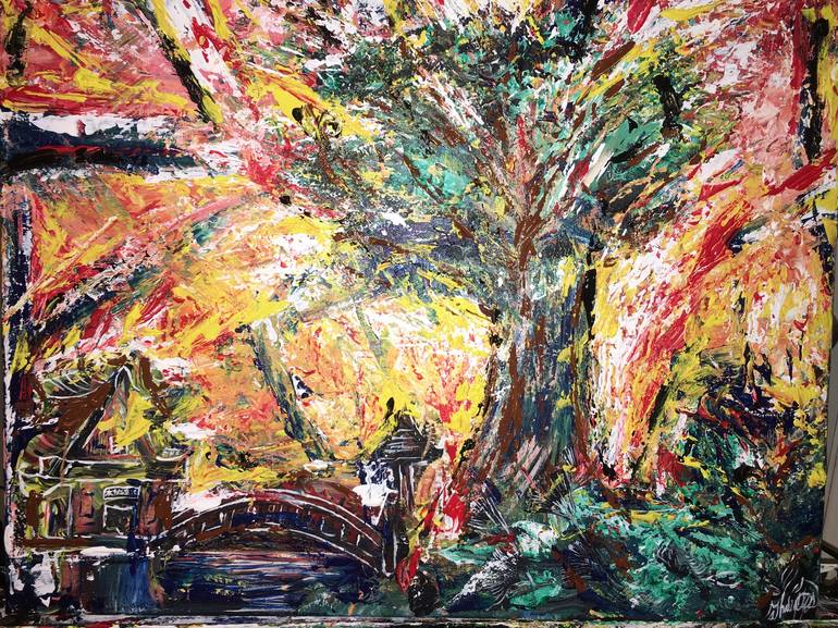 Started as an abstract with spatula cubic presses and became a Japanese picture of an remarkable time. Inspiration was born from my favorite movie Spirited Away by Hayao Miyazaki. As Chihiro, the main character, discovers the bath house, this landscape becomes melancholic for its burning flames in w...