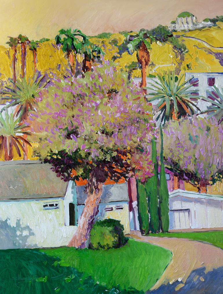 Bright colors, sub-tropical trees, and bungalow houses outline Hollywood's bright and sunny vibe. The Griffith observatory on the yellow hills and creamy sky together make a bright and warm feeling. The artwork is painted on oil-primed linen, and stretched on wooden bars. Thre is a wire on he back f...