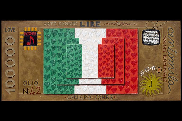 The work is inspired by the series of small watercolors, which I realized between 1995 and 1997, a free and ironic interpretation of 100,000 lire banknotes in Italy. The banknotes gave me the chance to overcome the concept of style. In the world of today, rich in the most different stimuli, the dang...