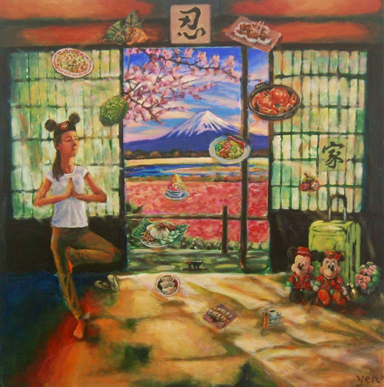 Whimsical Singapore heritage painting of girl travelling in Japan Tokyo doing yoga as she is homesick from missing local food like chilli crab, rice dumplings, ice kacang and durians. 2016. From artist Yen's Homesick (Heritage) series, inspired by a personal experience of studying abroad for a yea...
