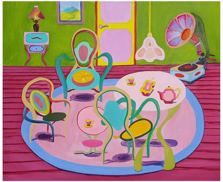 This painting depicts an imaginary home space of those things I am most comfortable with: old-fashioned music, sweet hot drinks, dim light and violet shadows.