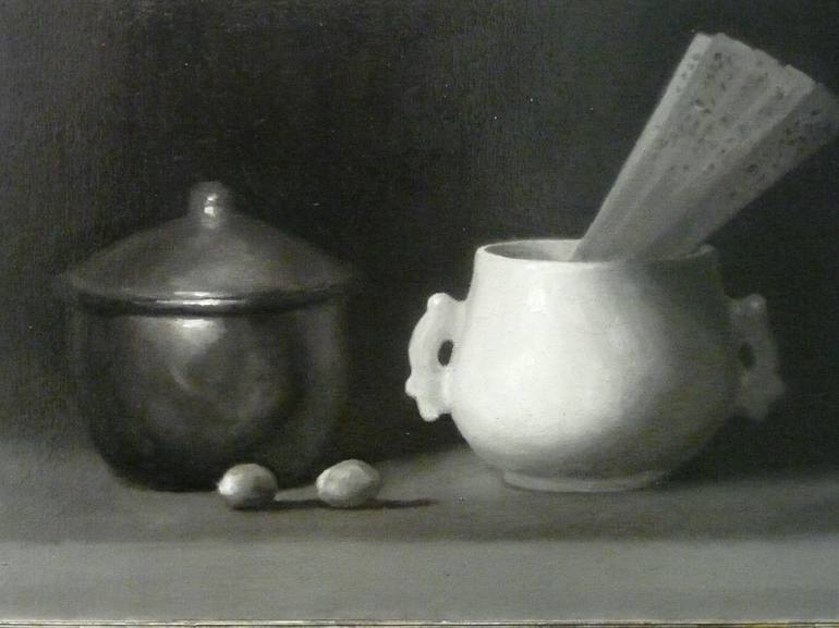 A clay pot from Lombok, a crackled celadon bowl from Hong Kong, with a balsa wood fan, and a pair of nutmegs as a nod to traditional Dutch still life paintings.
