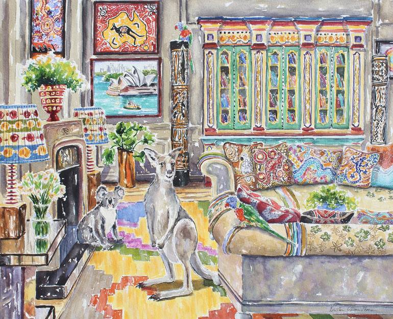 An original 16" x 20" or 40.64cm x 50.8cm, Australian-themed, watercolor and ink painting! A few of my favorite Australian animals including a koala bear, a wallaby and a pair of rainbow lorikeets are visiting this inviting, beautiful, Kit Kemp designed room in the Soho hotel, London! I added many s...