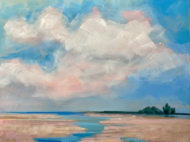 "Horizon of Hope" is a serene piece that reflects the grandeur and tranquility of nature, addressing the timeless theme of hope and aspiration. The expansive sky, painted in soft blues and pinks, casts its light over the serene waters, with the distant horizon drawing a line of possibilities. The wa...
