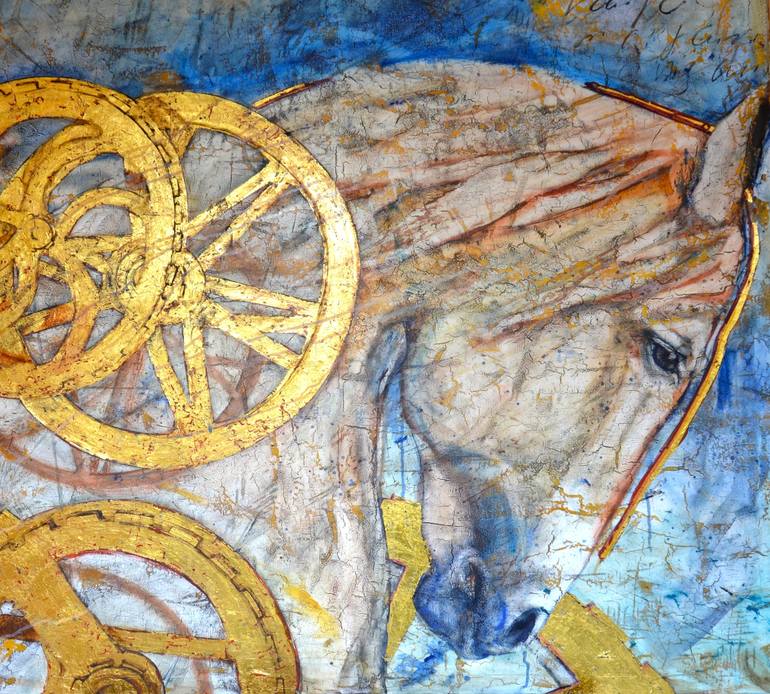 The gears , the inner workings of a clock are the symbol of the measure of time ; The horse symbolises speed. The horse is pulling the time. In this work I want to express the speed of time in our modern day society.