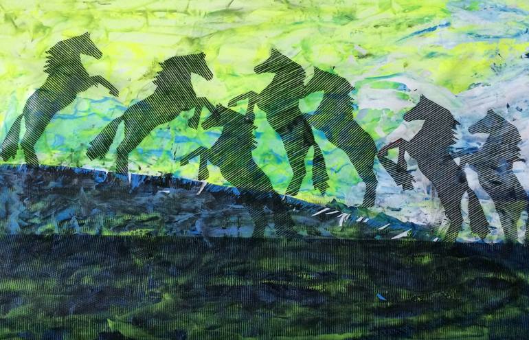 This vibrant and dynamic artwork depicts a group of silhouetted horses in motion, set against a luminous, abstract green and blue background. The striking black silhouettes, with fine line detailing, create a sense of movement and freedom as the horses gallop across a textured landscape. The contras...