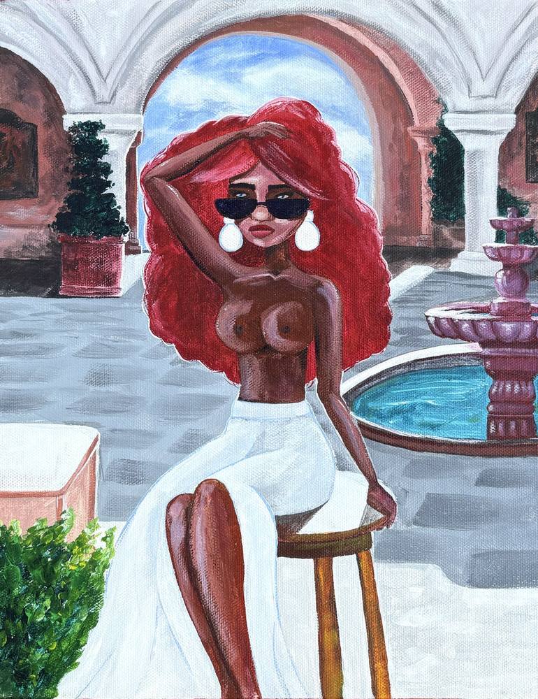 "Hot in Paradise" features a stunning, confident black woman with striking red hair, sitting topless in a white skirt. She rests peacefully in a paradise-like atrium, surrounded by elegant columns and a tranquil fountain. Free from worry, she embraces her beauty and power in a place where no judgme...