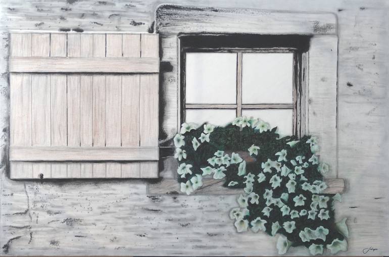 Beautiful presentation of an old window with beautiful flowers leaning over the parapet. I accept orders for this type of art - any subject. Aceito encomendas para este tipo de arte - qualquer assunto. Bela apresentação de uma antiga janela com belas flores debruçando do parapeito.