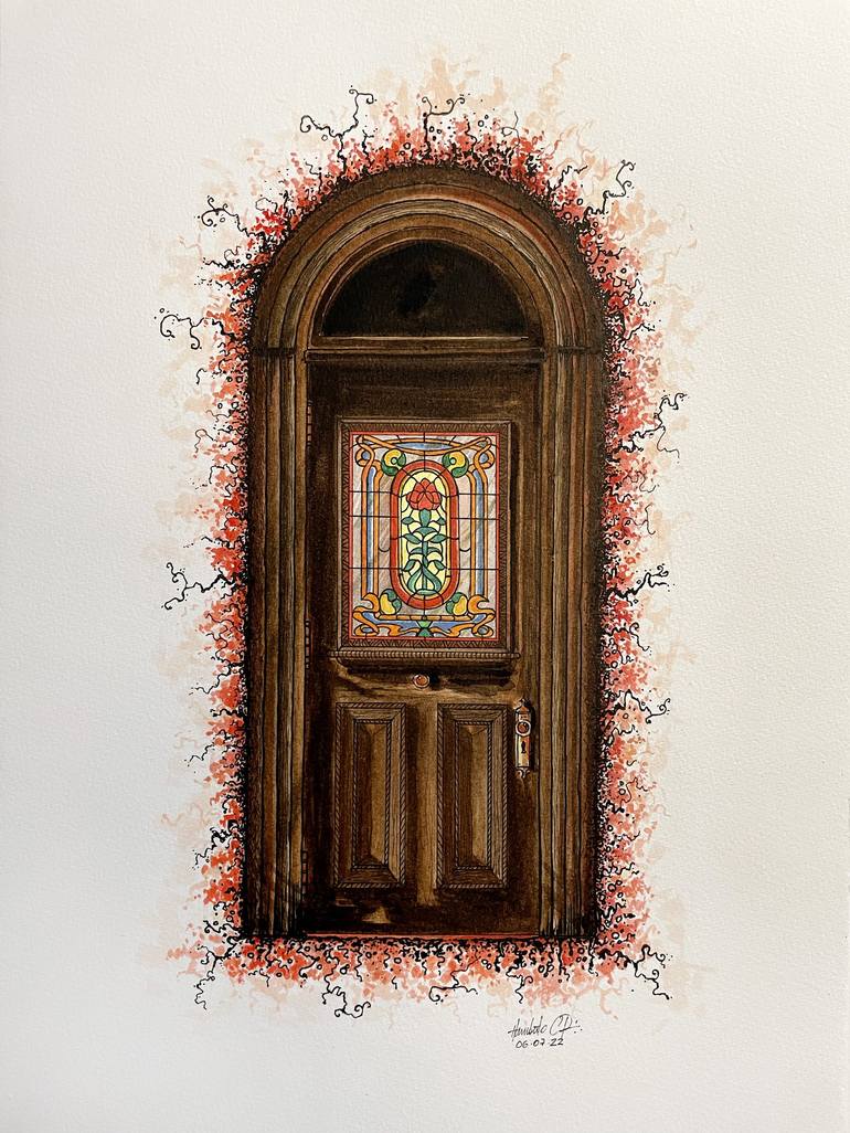 Work inspired by the series Stranger Things 4, the door and its beautiful stained glass window, a house marked by mystery, painted in watercolor and nankin, a unique piece! Paper 300 g/m Montaval.