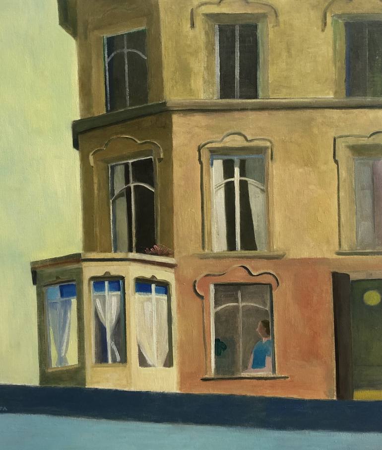 I saw this house in Barcelona passing by and I wanted to take a picture of it and may be paint it. At the end as I was passing by each day I became familiarize with its architecture. I have painted it in a very much Hopper style. I have put a figure behing a window, which gives the painting a sensat...