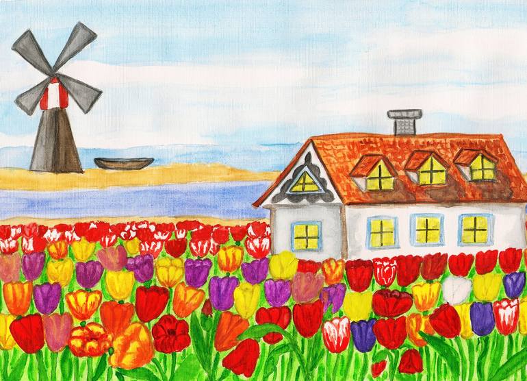 House in Holland with tulips and windmill, symbol of Holland.Watercolor painting on paper. This picture is a part of seria of pictures "Houses of the world", all pictures are in collection with same names, and seria of pictures with houses on meadows with blossom in collection "Summer". All my p...