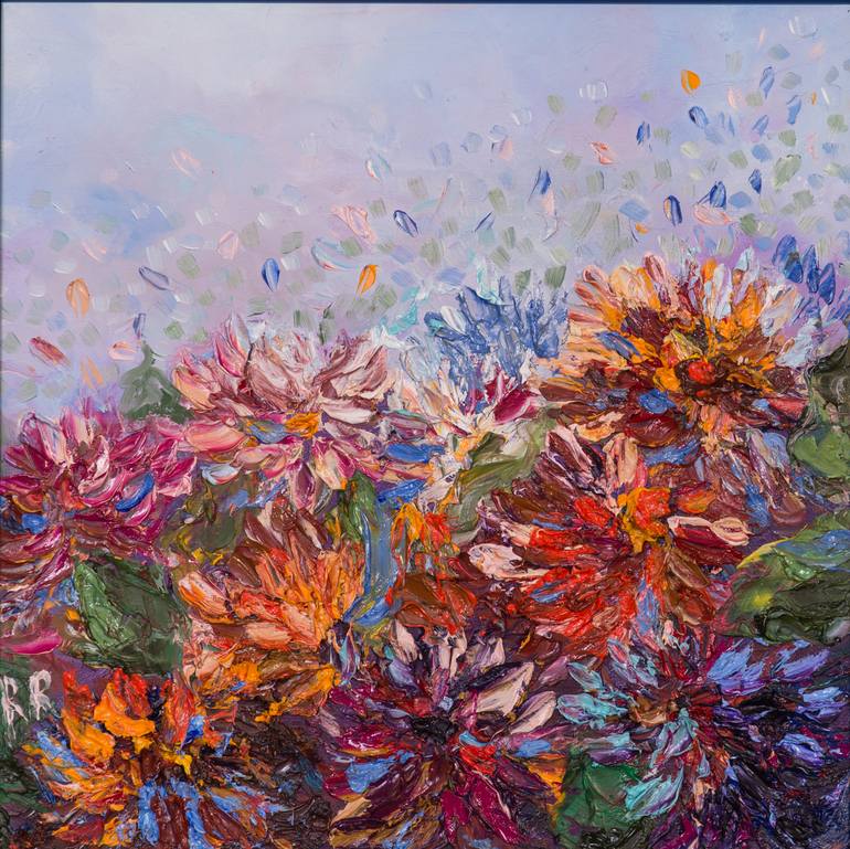 Lush, blooming hrizantemas made with palette knife using unusual color combinations.
