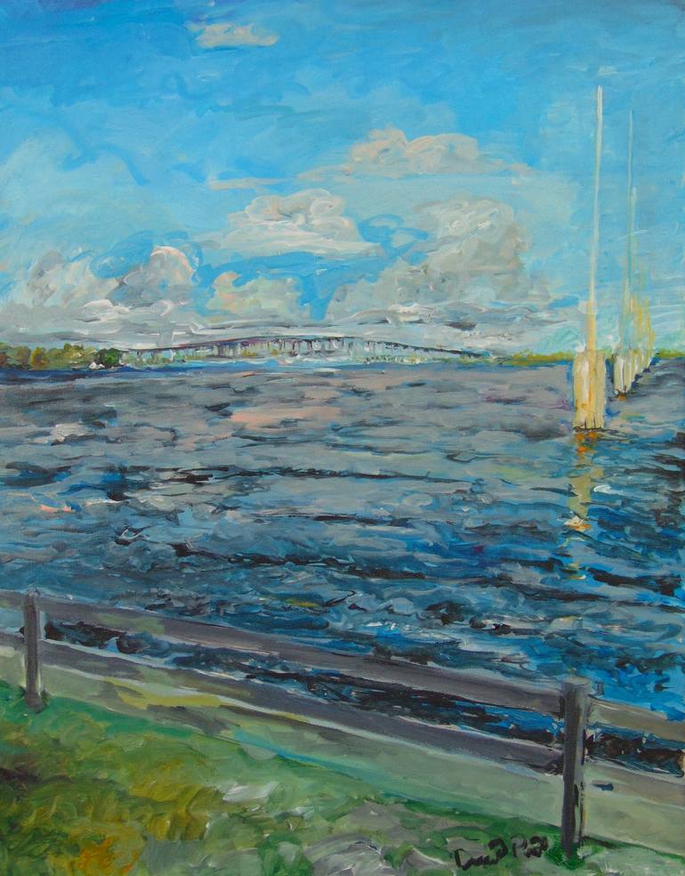 "Hubert Humphrey Causeway" as seen from Cocoa Riverfront Park in Cocoa, Florida. 16' x 20 " Acrylic on pre-stretched A beautiful day ending at the Riverfront Park. There were a lot of teenagers having their pictures taken with their dates before homecoming I think. A really nice spot to sit and...